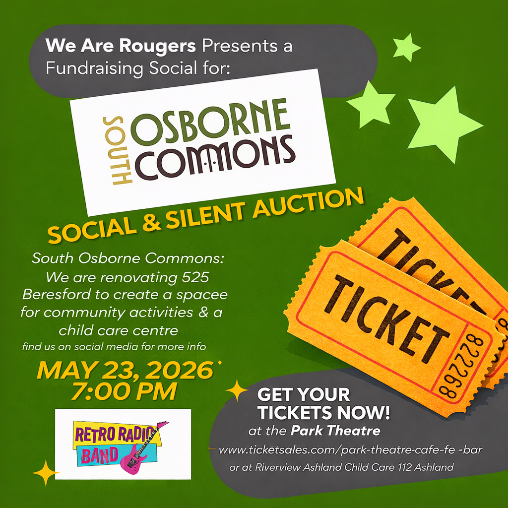We Are Rougers Presents the South Osborne Commons Fundraising Social & Silent Auction Join us at the Park Theatre on Saturday, May 23, for a great night of live music, community, and fundraising in support of South Osborne Commons. The goal is to help renovate 525 Beresford into a new hub for community activities and […]