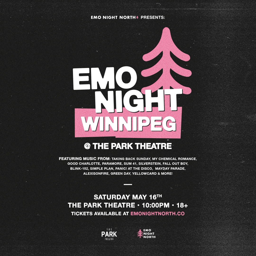 Winnipeg! On Saturday May 16th join us at Park Theatre. We will be spinning the classic emo anthems you know and love + MORE. See you there! Saturday May 16 2025 Venue: Park Theatre Doors: 10PM End: 2AM Must be 18+ with Valid Physical Photo ID. Tickets are non-refundable. See you there!